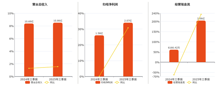公司营业总收入为10.86亿元。归母净利润为2.07亿元。经营活动现金净流入为2.06亿元。