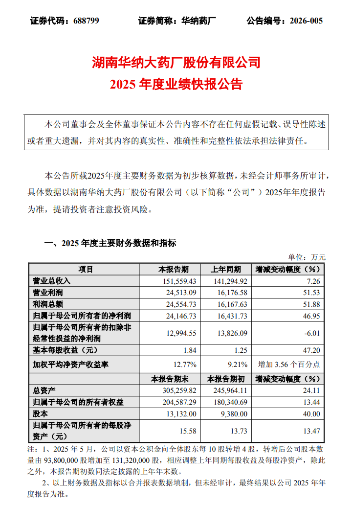 2月13日,华纳药厂(688799.SH)披露2025年度业绩快报,全年营业收入15.16亿元,上年同期14.13亿元,同比增长7.26%;利润总额2.46亿元,上年同期1.62亿元,同比增长51.88%;归属于上市公司股东的净利润2.41亿元,上年同期1.64亿元,同比增长46.95%;归属于上市公司股东的扣除非经常性损益的净利润1.30亿元,上年同期1.38亿元,同比下降6.01%;基本每股收益1.84元,上年同期1.25元,同比增长47.20%。