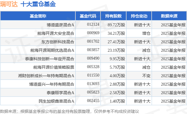 重仓瑞可达的前十大公募基金请见下表: