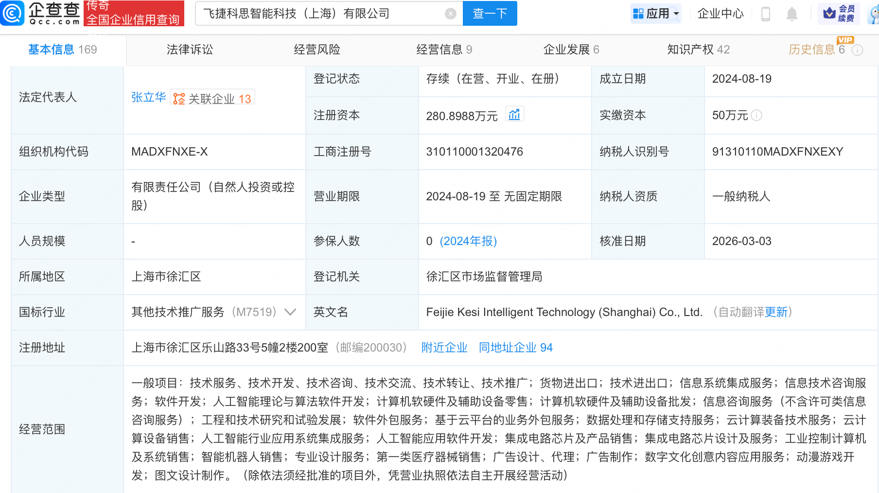 经营范围包含:人工智能行业应用系统集成服务;人工智能应用软件开发;集成电路芯片及产品销售;智能机器人销售等。