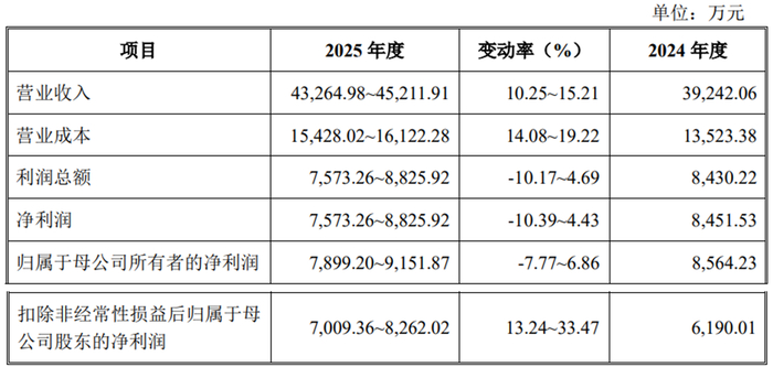 公司预计2025年全年营业收入为43,264.98万元至45,211.91万元,变动率为10.25%至15.21%;净利润为7,573.26万元至8,825.92万元,变动率为-10.39%至4.43%;归属于母公司所有者的净利润为7,899.20万元至9,151.87万元,变动率为-7.77%至6.86%;扣除非经常性损益后归属于母公司股东的净利润为7,009.36万元至8,262.02万元,变动率为13.24%至33.47%。