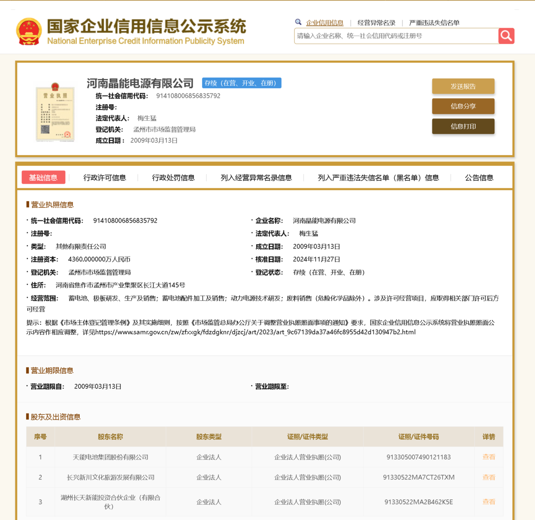公开信息显示,河南晶能电源有限公司成立于2009年03月13日,法定代表人梅生猛,大股东为天能电池集团股份有限公司(天能股份 688819)。