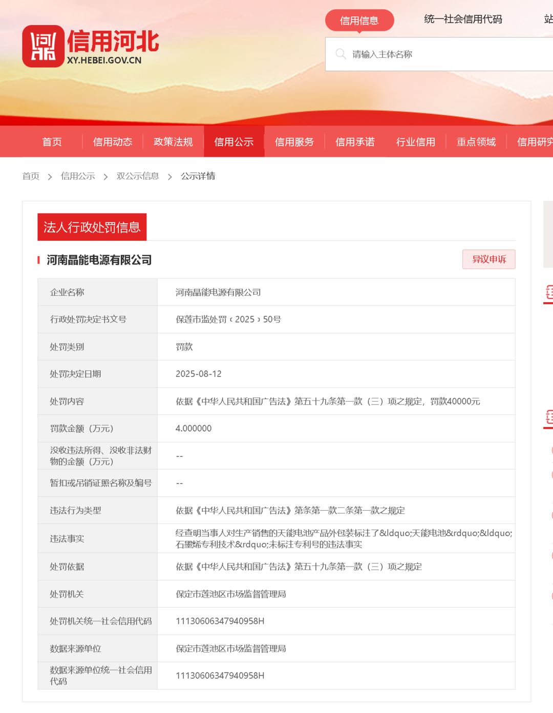 近日,记者从信用河北获悉,河南晶能电源有限公司因违反《中华人民共和国广告法》第条第一款二条第一款之规定,被保定市莲池区市场监督管理局罚款4万元。