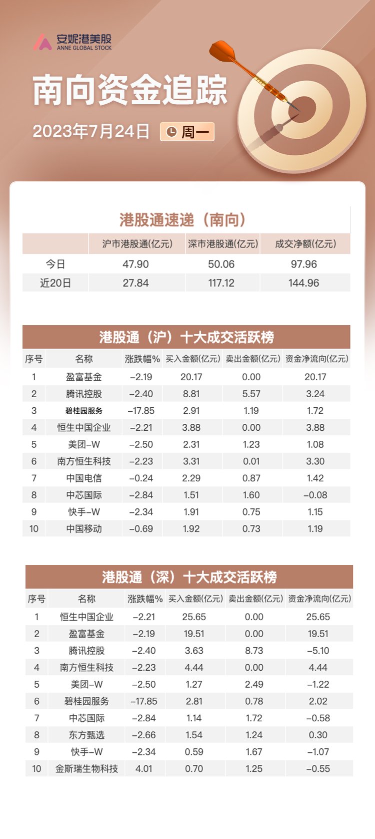 南向资金7月24日净流入约98亿:加仓两大电信运营商 减持中芯国际及腾讯