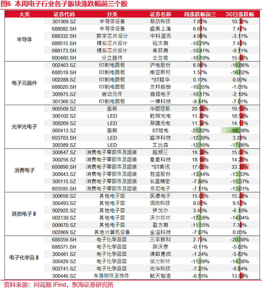 本周半导体细分板块涨跌幅分别为:其他电子Ⅲ(-5.14%)、LED(-2.66%)、被动元件(-1.71%)、印制电路板(-3.86%)、面板(-2.73%)、光学元件(-2.69%)、消费电子零部件及组装(-3.42%)、品牌消费电子(-1.74%)、半导体材料(-5.12%)、模拟芯片设计(-3.55%)、电子化学品Ⅲ(-4.14%)、分立器件(-6.61%)、半导体设备(-2.81%)、数字芯片设计(-5.72%)、集成电路封测(-4.98%)。