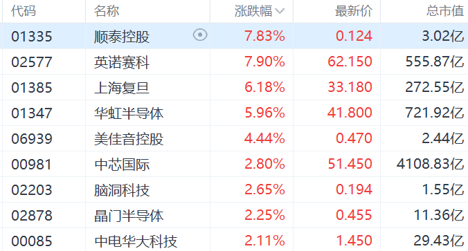港股半导体股走强,顺泰控股、英诺赛科涨超7%,上海复旦涨超6%,华虹半导体涨超5%,中芯国际、晶门半导体涨超2%