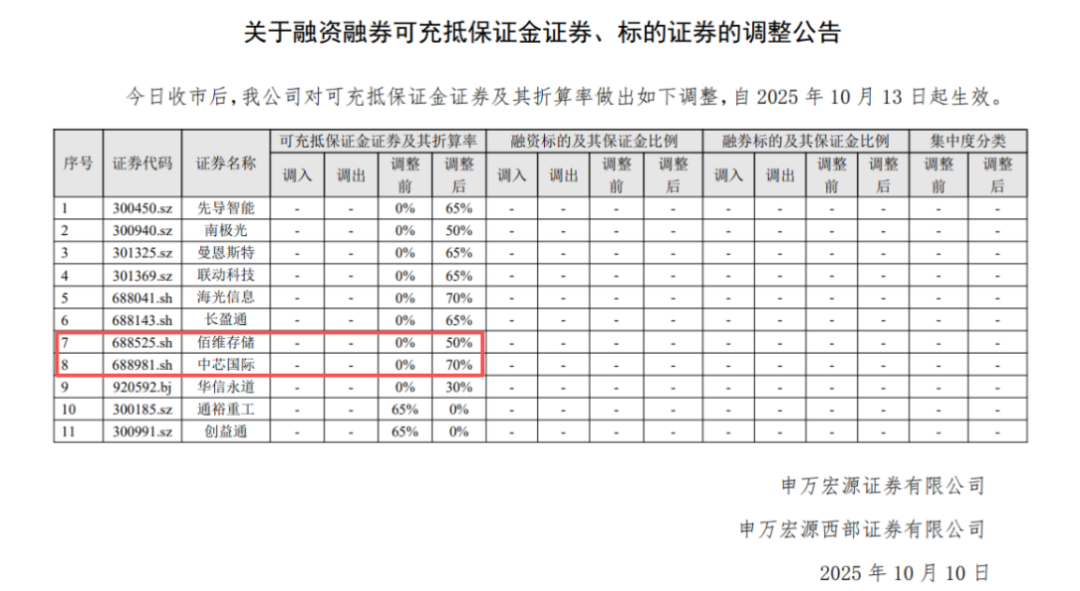 其中,先导智能、南极光、曼恩斯特、联动科技、海光信息、长盈通、佰维存储、中芯国际、华信永道等的可充抵保证金证券折算率由0%上调至30%-70%不等,就在10月9日,佰维存储、中芯国际等在上一交易日被多家券商将折算率调为零。而通裕重工、创益通两股的折算率则由65%下调至0%。