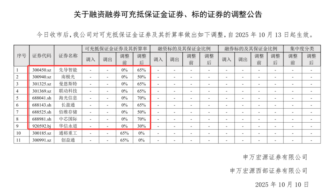 10月10日,包括申万宏源证券、招商证券在内的部分券商收市后再度调整了融资融券可充抵保证金证券及折算率。