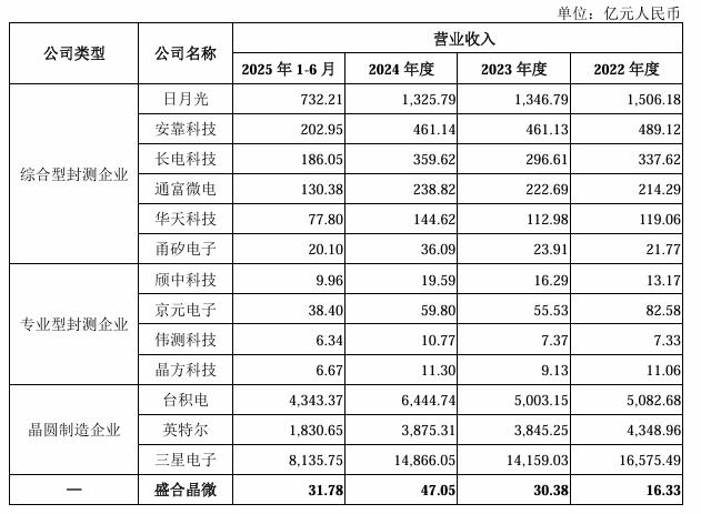 综合型封测企业中,盛合晶微将日月光、安靠科技、长电科技、通富微电、华天科技、甬矽电子作为可对比公司;专业型封测企业中,其可对比公司为颀中科技、京元电子、伟测科技、晶方科技;晶圆制造企业中,其可对比公司为台积电、英特尔、三星电子。
