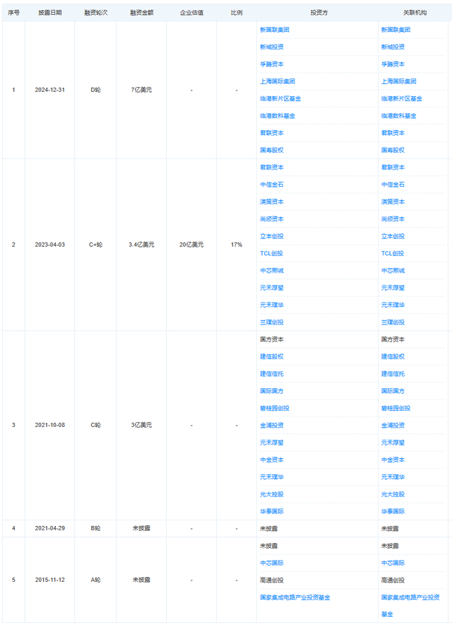 成立至今,盛合晶微共历经5次融资,其中多轮融资金额超过数亿美元,背后投资方阵容庞大。