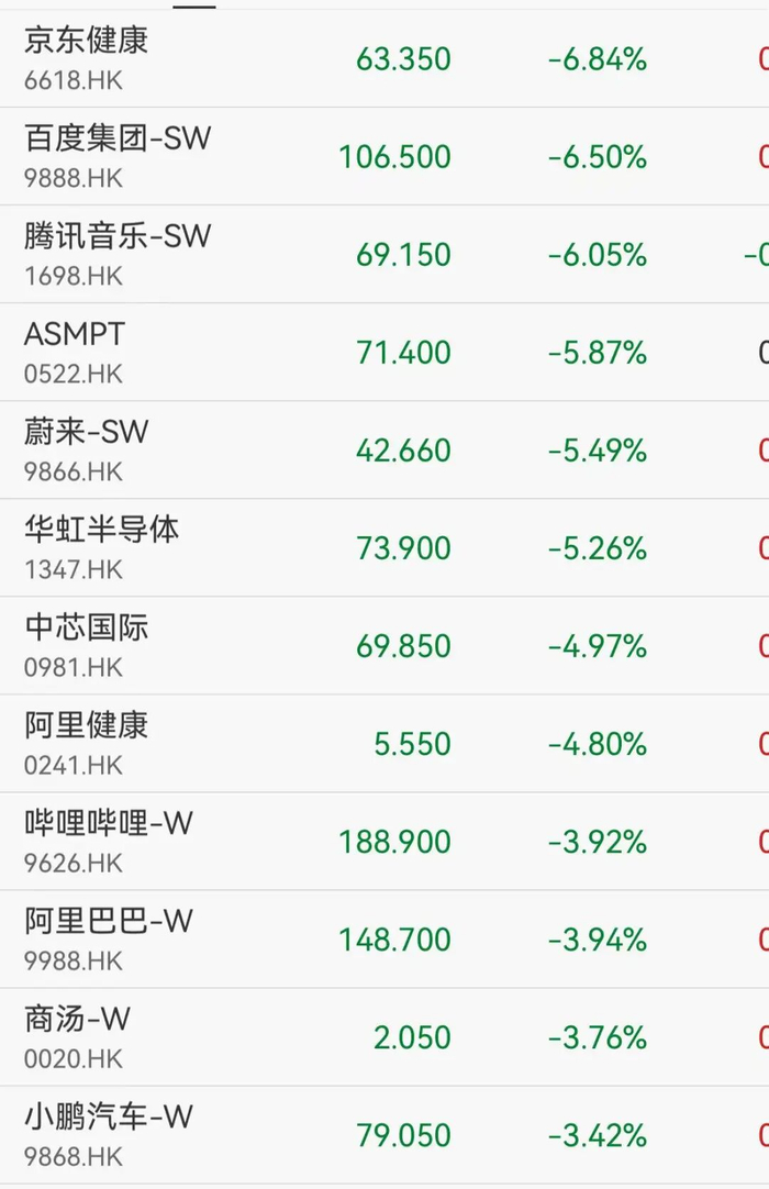 恒生科技跌超3%,中芯国际跌近5%