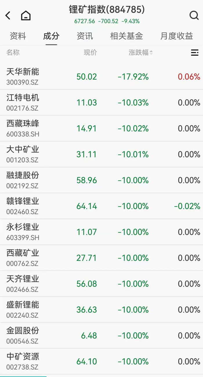 锂电产业链全线重挫,其中锂矿板块以9.43%的跌幅,领跌A股。江特电机、西藏珠峰、赣锋锂业、西藏矿业等多股跌停,天华新能重挫近18%。