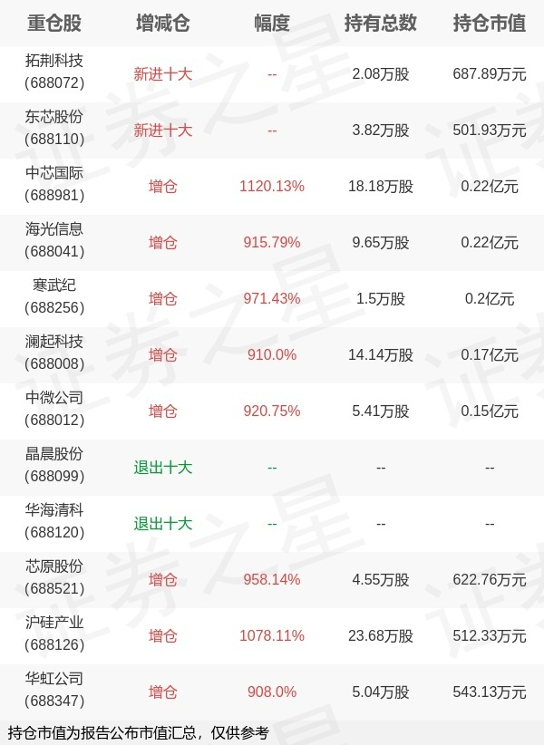 证券之星消息,1月22日嘉实基金旗下田光远管理的嘉实上证科创板芯片交易型开放式指数基金发起式联接基金公布年报,近1年净值增长率81.0%。与上一季度相比,该基金前十大重仓股新增拓荆科技,东芯股份;并对中芯国际增仓16.69万股,为该基金第一大重仓股;晶晨股份,华海清科等退出前十大重仓股;详细数据如下: