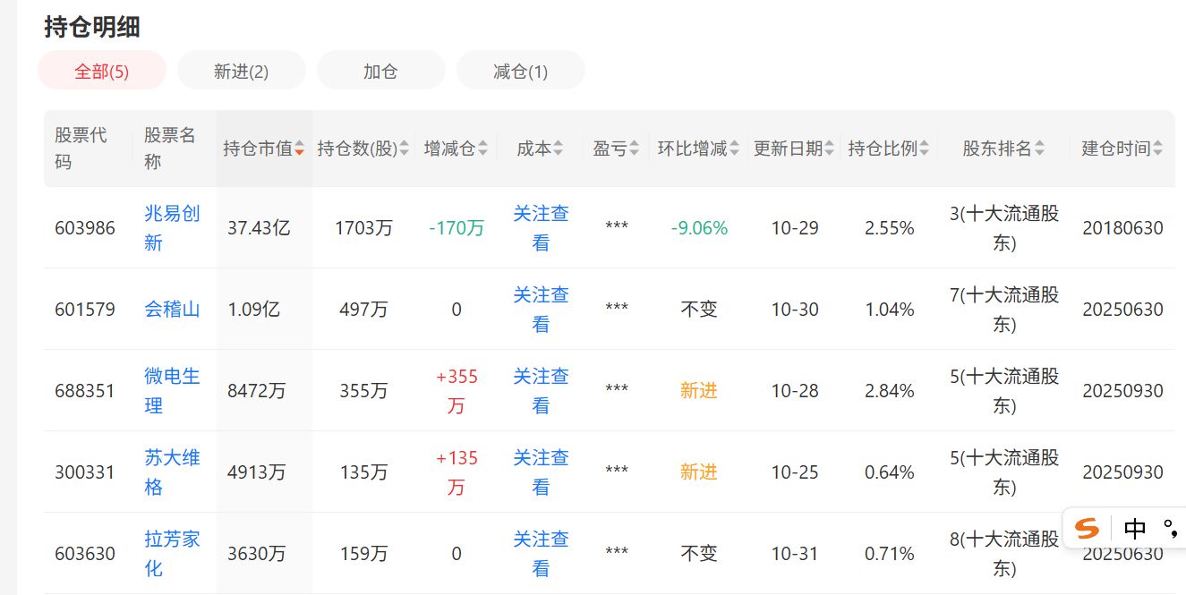 兆易创新是今年半导体的大牛股,今年年初至10月31日,涨幅超过100%。一直以来,葛卫东都重仓兆易创新,在本轮上涨中赚得盆满钵满。今年三季度,葛卫东在兆易创新上涨过程中减仓了170万股;但剩余持仓仍达到1703万股,市值高达37.43亿元,为其第一大重仓股。值得一提的是,近期兆易创新股价再创新高。如果葛卫东近期没有减持,那么兆易创新每涨跌1%,他的持仓市值波动就高达300万元以上。