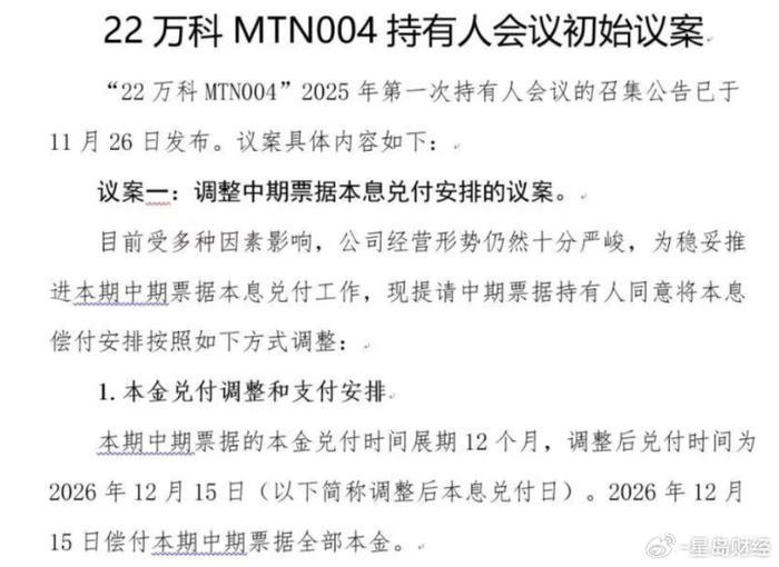 据了解,此前11月26日,“22万科MTN004”主承销商浦发银行发布公告,该行作为召集人拟召开债券持有人会议,对本期债券展期相关事项进行审议。该笔债券余额20亿元,利率3%,原本金兑付日为2025年12月15日。