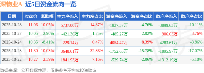 证券之星消息,深物业A10月28日涨停收盘,收盘价11.06元。该股于13点25分涨停,未打开涨停,截止收盘封单资金为8114.46万元,占其流通市值1.39%。