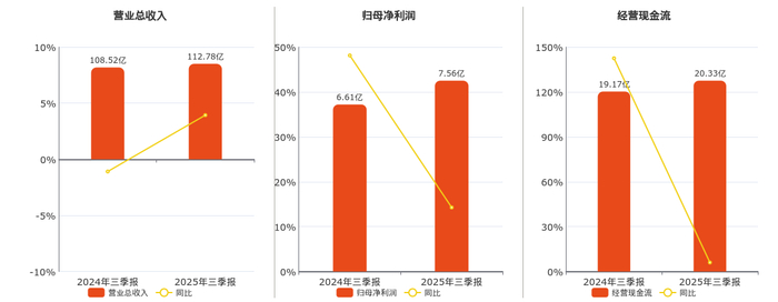 公司营业总收入为112.78亿元,在已披露的同业公司中排名第12,较去年同报告期营业总收入增加4.26亿元,同比较去年同期上涨3.93%。归母净利润为7.56亿元,在已披露的同业公司中排名第11,较去年同报告期归母净利润增加9435.13万元,实现2年连续上涨,同比较去年同期上涨14.27%。经营活动现金净流入为20.33亿元,在已披露的同业公司中排名第4,较去年同报告期经营活动现金净流入增加1.16亿元,实现2年连续上涨,同比较去年同期上涨6.05%。