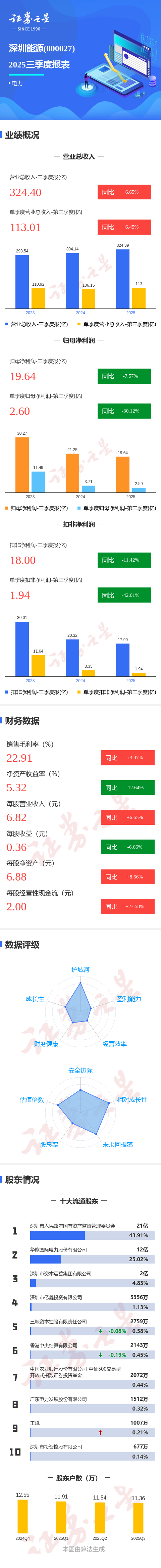 图解深圳能源三季报:第三季度单季净利润同比下降30.12%
