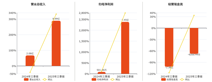 公司营业总收入为8.99亿元,较去年同报告期营业总收入增加6.91亿元,同比较去年同期上涨331.66%。归母净利润为1.45亿元,较去年同报告期归母净利润增加1.40亿元,实现2年连续上涨,同比较去年同期上涨2791.57%。经营活动现金净流入为-9200.44万元,较去年同报告期经营活动现金净流入增加4564.76万元。