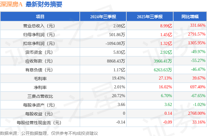 据证券之星公开数据整理,近期深深房A(000029)发布2025年三季报。截至本报告期末,公司营业总收入8.99亿元,同比上升331.66%,归母净利润1.45亿元,同比上升2791.57%。按单季度数据看,第三季度营业总收入2.61亿元,同比上升253.33%,第三季度归母净利润4209.0万元,同比上升7066.86%。本报告期深深房A盈利能力上升,毛利率同比增幅39.67%,净利率同比增幅697.4%。