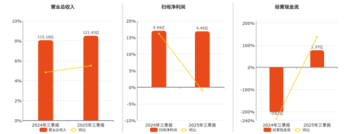 公司营业总收入为121.43亿元,在已披露的同业公司中排名第9,较去年同报告期营业总收入增加6.33亿元,实现3年连续上涨,同比较去年同期上涨5.50%。归母净利润为4.40亿元,在已披露的同业公司中排名第18,较去年同报告期归母净利润减少409.60万元,同比较去年同期下降0.92%。经营活动现金净流入为1.37亿元,在已披露的同业公司中排名第66,较去年同报告期经营活动现金净流入增加5.00亿元。