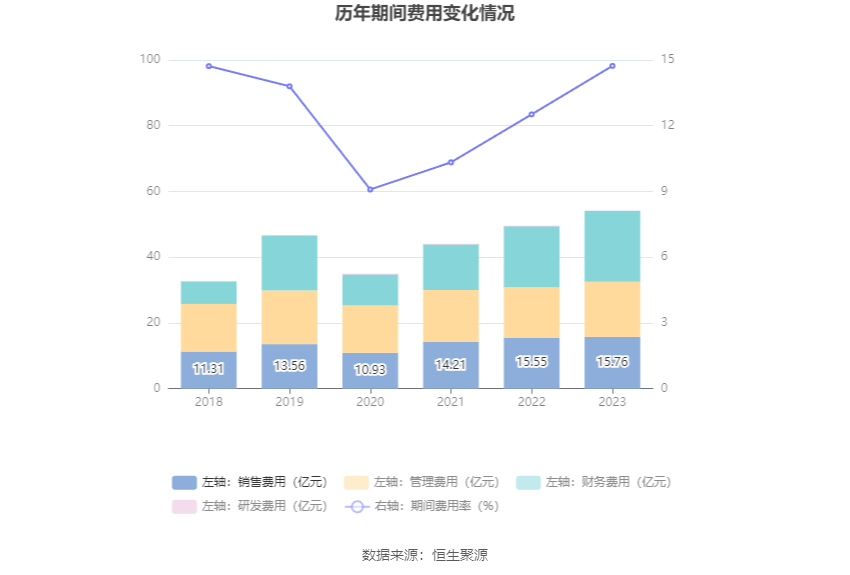 2023年,公司期间费用为54.16亿元,较上年同期增加4.63亿元;期间费用率为14.73%,较上年同期上升2.21个百分点。其中,销售费用同比增长1.38%,管理费用同比增长9.81%,研发费用同比下降67.46%,财务费用同比增长16.25%。