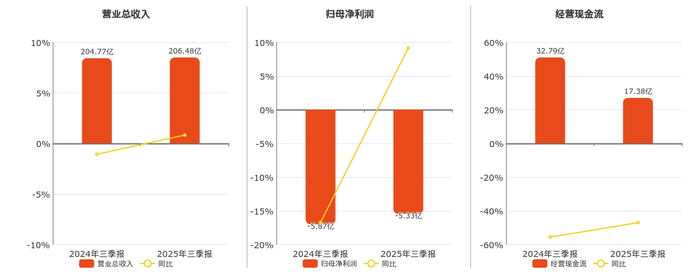 公司营业总收入为206.48亿元,在已披露的同业公司中排名第10,较去年同报告期营业总收入增加1.71亿元,同比较去年同期上涨0.83%。归母净利润为-5.33亿元,较去年同报告期归母净利润增加5379.01万元。经营活动现金净流入为17.38亿元,在已披露的同业公司中排名第11。