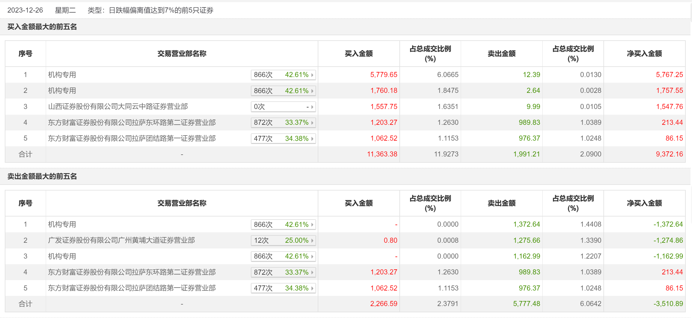12月26日,深桑达A今日跌停,全天换手率达7.25%,振幅达9.23%。龙虎榜数据显示,营业部席位合计净买入5561.68万元。其中,机构买入7539.83万元,卖出2550.65万元,合计净买入4989.18万元。此外,广发证券广州黄埔大道证券营业部、东方财富证券拉萨东环路第二证券营业部分别卖出1275.66万元、989.83万元;山西证券大同云中路证券营业部、东方财富证券拉萨东环路第二证券营业部分别买入1557.75万元、1203.27万元。