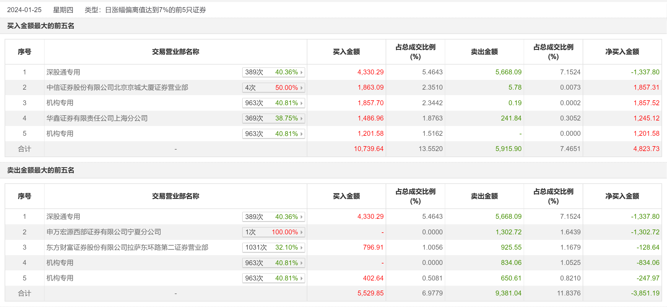 1月25日,深桑达A今日涨停,全天换手率达6.74%,振幅达10.9%。龙虎榜数据显示,营业部席位合计净买入2310.34万元。其中,机构买入3461.93万元,卖出1484.86万元,合计净买入1977.07万元。此外,深股通专用、中信证券北京京城大厦证券营业部分别买入4330.29万元、1863.09万元;深股通专用、申万宏源西部证券有限公司宁夏分公司分别卖出5668.09万元、1302.72万元。
