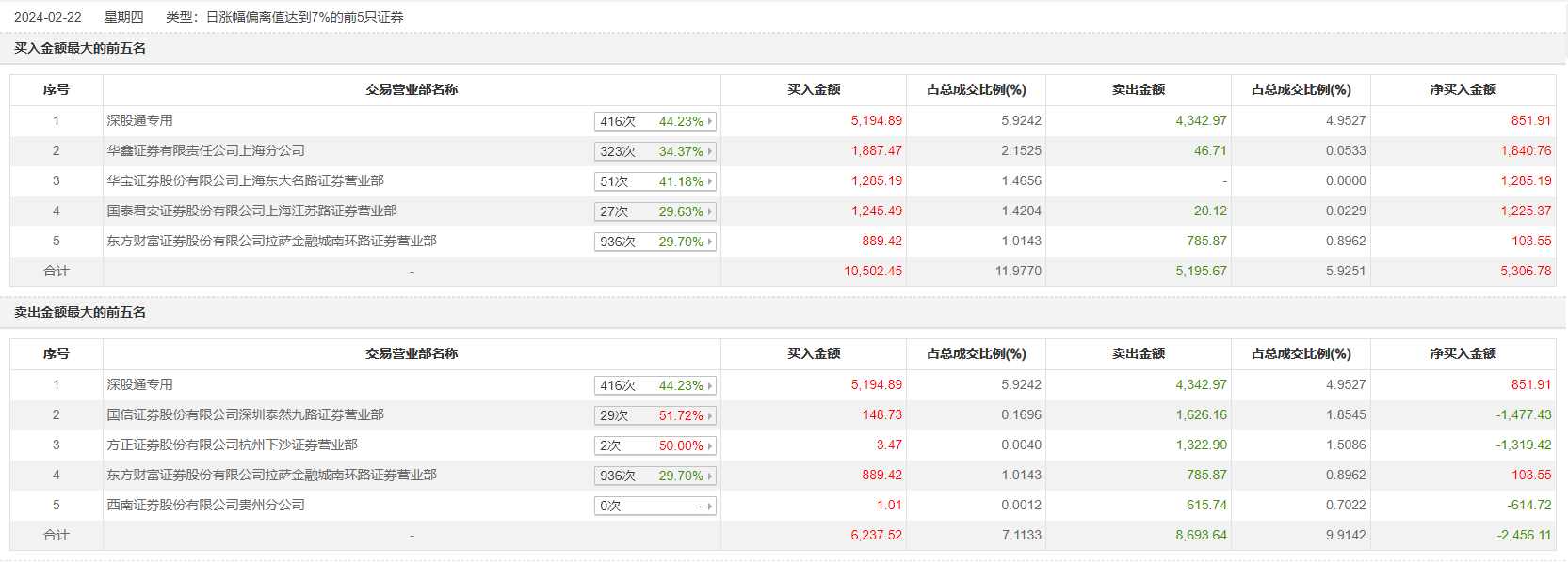 2月22日,特发信息(维权)今日涨停,龙虎榜数据显示,上榜营业部席位全天成交1.94亿元,占当日总成交金额比例为22.14%。其中,买入金额为1.07亿元,卖出金额为8760.47万元,合计净买入1895.2万元。