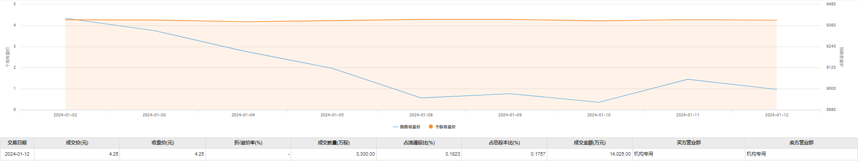 今日大宗交易成交3300万股,成交额1.4亿元,占当日总成交额的20.88%,成交价4.25元,较市场收盘价持平。