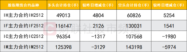 四大期指主力合约中,IH、IF合约多空双方均加仓,IC、IM合约多空双方均减仓,IM合约空头减仓数量较多。