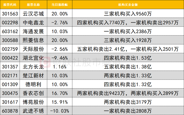 今日龙虎榜机构活跃度明显降低,买入个股数量和净买入规模大幅减少。今日20cm涨停的云汉芯城获三家机构买入9560万。