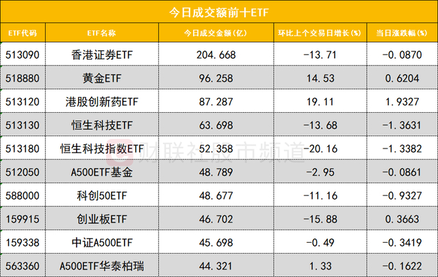 从成交额前十的ETF来看,香港证券ETF(513090)成交额位居首位,黄金ETF(518880)成交额位居次席。