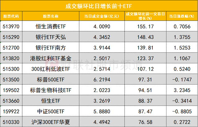 从成交额环比增长前十的ETF来看,恒生消费ETF(513970)成交额环比增长155%位居首位;银行ETF天弘(515290)成交额环比增长148%位居次席。