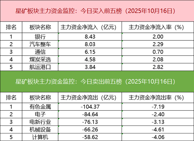 板块资金流出方面,有色金属板块主力资金净流出居首。