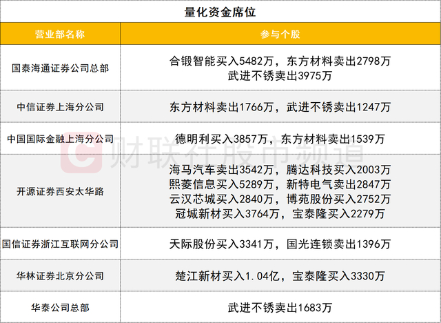 量化资金活跃度不高,楚江新材获一家量化席位买入1.04亿。宝泰隆获两家量化席位买入5609万。