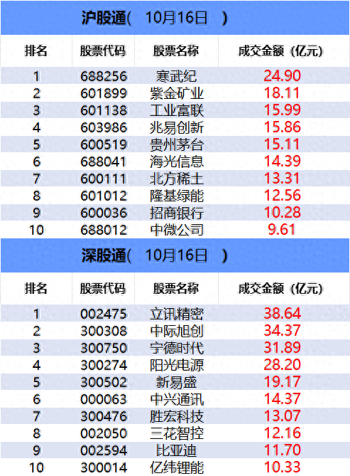 从沪股通前十大成交个股来看,寒武纪位居首位;紫金矿业和工业富联分居二、三位。