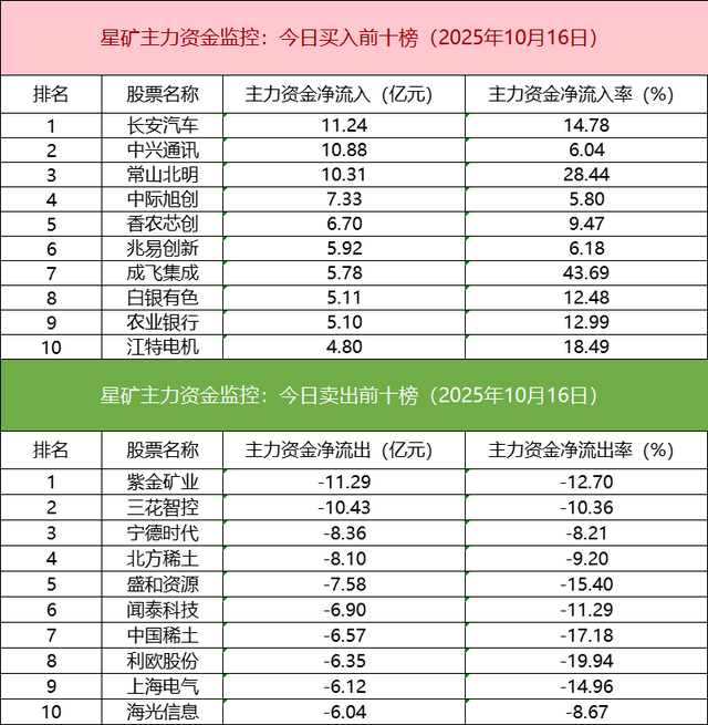 主力资金流出前十的个股所属板块较为分散,紫金矿业净流出居首。