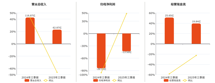公司营业总收入为62.87亿元,在已披露的同业公司中排名第21。归母净利润为-13.50亿元,较去年同报告期归母净利润增加12.65亿元。经营活动现金净流入为19.84亿元,在已披露的同业公司中排名第10。