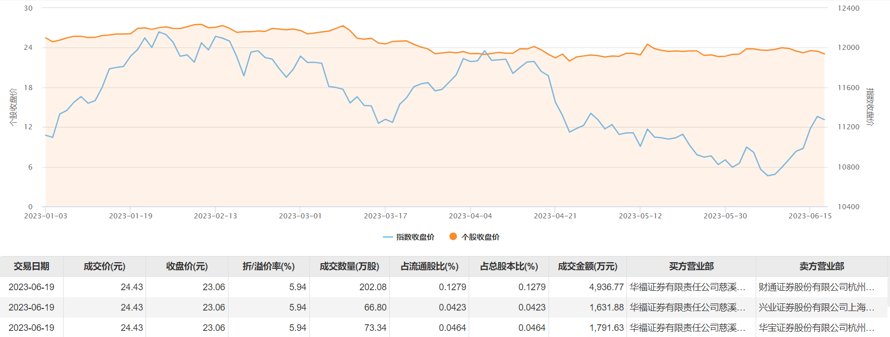 6月19日大宗交易平台共发生3笔成交,合计成交量342.22万股,成交金额8360.28万元,溢价率5.94%。进一步统计,近3个月内该股累计发生16笔大宗交易,合计成交金额为7.98亿元。