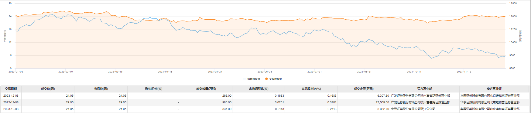 今日大宗交易成交1580万股,成交额3.8亿元,占当日总成交额的60.14%,成交价24.05元,较市场收盘价持平。