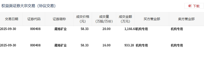 9月30日,藏格矿业大宗交易成交36万股,成交额2099.88万元,占当日总成交额的2.43%,成交价58.33元,较市场收盘价58.33元持平。