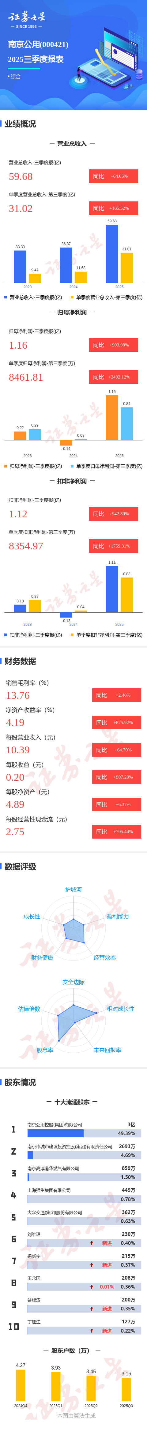 图解南京公用三季报:第三季度单季净利润同比增长2492.12%