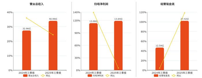 公司营业总收入为40.99亿元,在已披露的同业公司中排名第42。归母净利润为13.64亿元。经营活动现金净流入为27.42亿元。