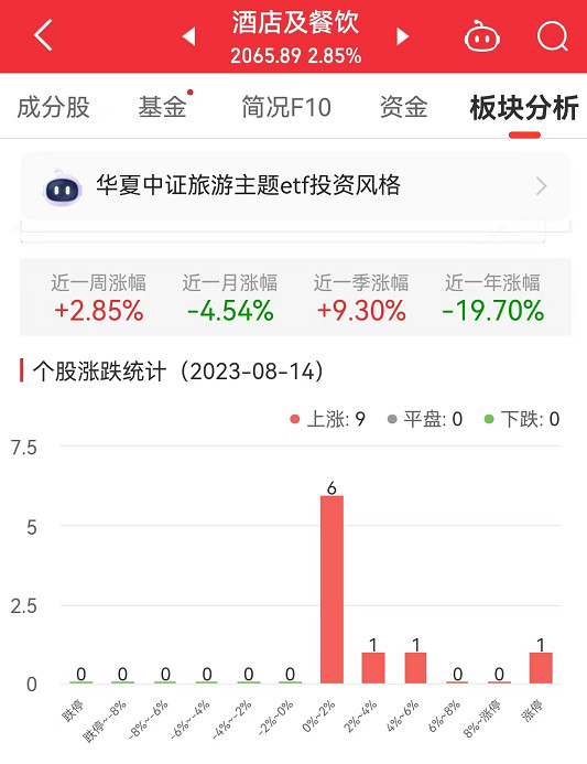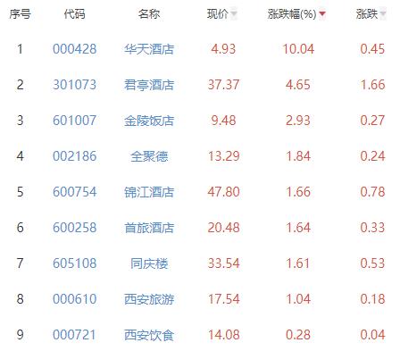 其中,华天酒店、君亭酒店、金陵饭店、全聚德、锦江酒店、首旅酒店、同庆楼、西安旅游、西安饮食位列板块涨幅前五位,涨幅分别为10.04%、4.65%、2.93%、1.84%、1.66%、1.64%、1.61%、1.04%、0.28%。