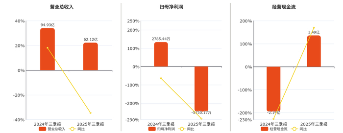 公司营业总收入为62.12亿元,较去年同报告期营业总收入减少32.82亿元,同比较去年同期下降34.57%。归母净利润为-5150.17万元,较去年同报告期归母净利润减少7935.61万元,同比较去年同期下降284.90%。经营活动现金净流入为1.49亿元,较去年同报告期经营活动现金净流入增加3.63亿元。