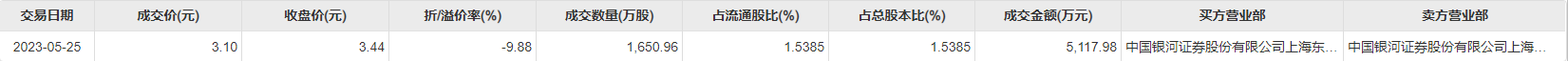 今日大宗交易成交1650.96万股,成交额5117.98万元,占当日总成交额的82.24%,成交价3.1元,较市场收盘价折价9.88%。