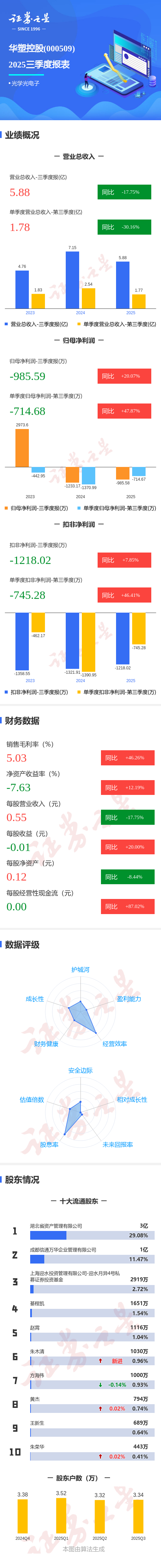 证券之星消息,华塑控股2025年三季报显示,前三季度公司主营收入5.88亿元,同比下降17.76%;归母净利润-985.59万元,同比上升20.08%;扣非净利润-1218.02万元,同比上升7.86%;其中2025年第三季度,公司单季度主营收入1.78亿元,同比下降30.16%;单季度归母净利润-714.68万元,同比上升47.87%;单季度扣非净利润-745.28万元,同比上升46.42%;负债率76.45%,财务费用944.04万元,毛利率5.03%。