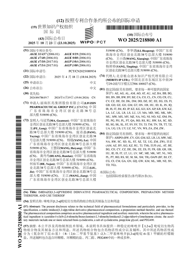 丽珠集团公布国际专利申请:“咪唑并[1,2-a]吡啶衍生物药物组合物及其制备方法和用途”